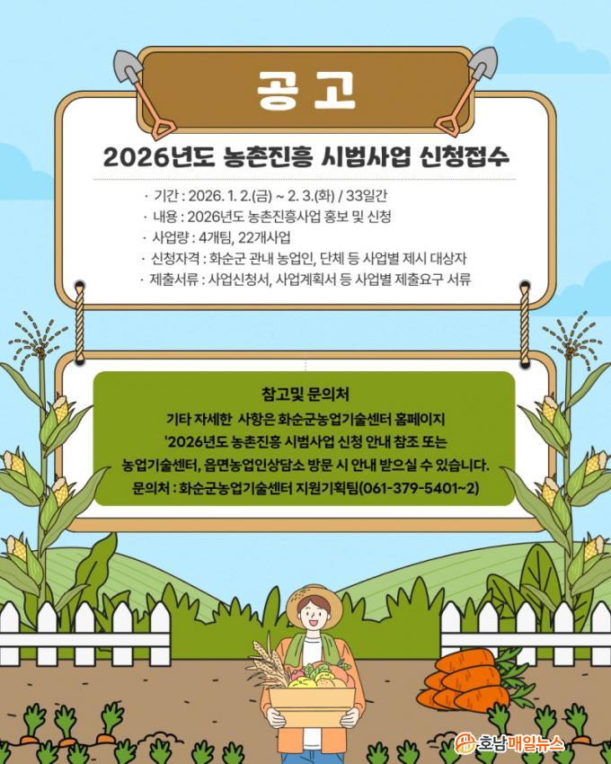 ÀÚ¼¼ÇÑ »ç¾÷ ³»¿ëÀº ȼø±ºÃ» ¹× ȼø±º³ó¾÷±â¼ú¼¾ÅÍ ´©¸®Áý¿¡ °Ô½ÃµÈ ¡®2026³â ³óÃÌÁøÈï ½Ã¹ü»ç¾÷ ½Åû °ø°í¡¯¸¦ ÅëÇÏ¿© È®ÀÎÇÒ ¼ö ÀÖÀ¸¸ç, »ç¾÷ ´ë»óÀÚ´Â ÇöÀå ½É»ç¿Í ³ó¾÷»êÇÐÇùµ¿½ÉÀÇȸ ½ÉÀÇ µîÀ» °ÅÃÄ ÃÖÁ¾ ¼±Á¤µÈ´Ù.