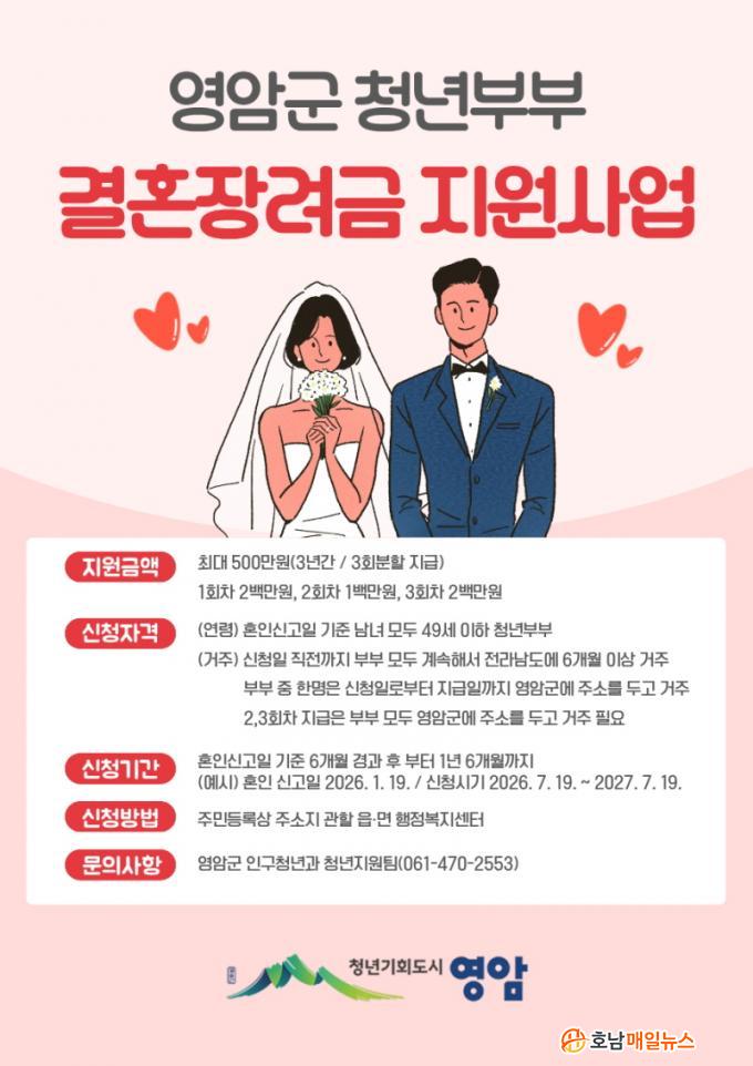 ¡®2026 û³âºÎºÎ °áÈ¥Àå·Á±Ý Áö¿ø»ç¾÷¡¯¿¡ µû¸¥ ÀÌ Áö¿øÀº, ½ÅÈ¥ºÎºÎ °æÁ¦ ºÎ´ã ¿ÏÈ, û³â Àα¸ À¯ÀÔ ¹× Áö¿ª Á¤ÂøÀ» À§ÇÑ °Í. °áÈ¥Àå·Á±ÝÀº 3³â°£ 3ȸ·Î ³ª´² Áö±ÞµÇ¸ç, 1Â÷ 200¸¸¿ø, 2Â÷ 100¸¸¿ø, 3Â÷ 200¸¸¿øÀ» Áö±ÞÇÑ´Ù. ÃÖÃÊ ½ÅûÀϺÎÅÍ Áö±ÞÀϱîÁö ºÎºÎ ¸ðµÎ °è¼ÓÇØ¼ ¿µ¾Ï±º¹ÎÀ̾î¾ß Àü¾× Áö¿ø¹ÞÀ» ¼ö ÀÖ´Ù.