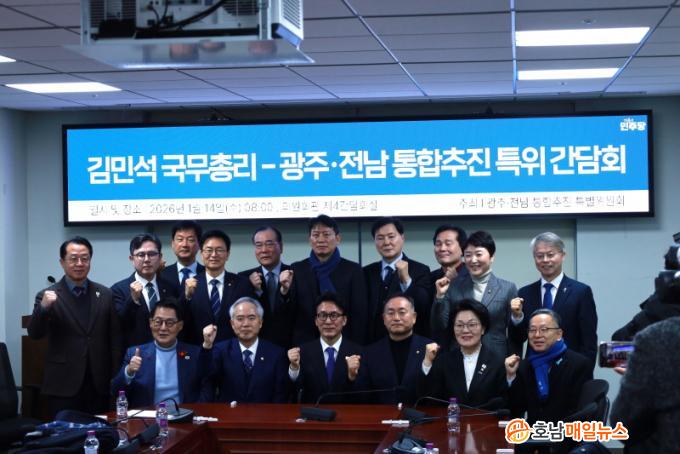 À̹ø °£´ãȸ´Â Àü³²¡¤±¤ÁÖ ÅëÇÕÀÇ Çʿ伺À» ÀçÈ®ÀÎÇϰí, ±è¹Î¼® ±¹¹«ÃѸ®¿Í Àü³²¡¤±¤ÁÖ ±¹È¸ÀÇ¿øÀÌ ÇÔ²² Àü³²¡¤±¤ÁÖ ÅëÇÕ Æ¯º°¹ý Á¦Á¤ÀÇ ¿øÄ¢°ú ¹æÇ⼺, ±Ç¿ªº° ¼÷¿ø»ç¾÷°ú Çö¾È¿¡ ´ëÇØ ÀǰßÀ» ³ª´©±â À§ÇØ ¸¶·ÃµÆ´Ù.