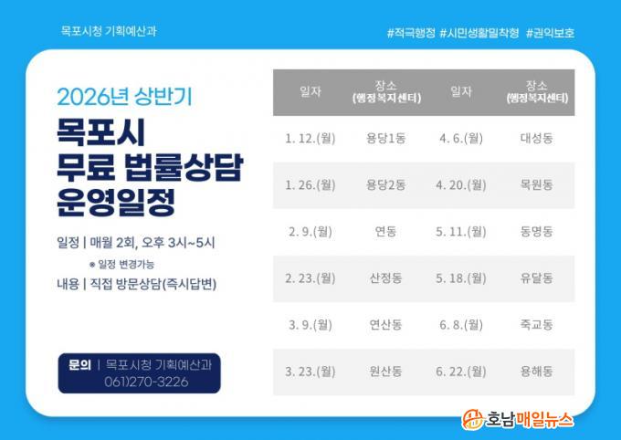 ÇÑÆí, »ó´ã ÀÏÁ¤Àº »çÁ¤¿¡ µû¶ó º¯°æµÉ ¼ö ÀÖÀ¸¸ç, ¹«·á ¹ý·ü»ó´ã°ú °ü·ÃÇÑ ÀÚ¼¼ÇÑ »çÇ×Àº ¸ñÆ÷½Ãû ±âȹ¿¹»ê°ú(061-270-3226)·Î ¹®ÀÇÇÏ¸é µÈ´Ù.