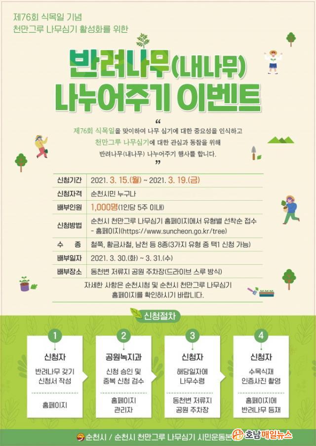 ¼øÃµ½Ã´Â ¹Ý·Á³ª¹«(³» ³ª¹«)¸¦ ½É°í °¡²Ù´Â ºÐÀ§±â¸¦ Á¶¼ºÇÏ¿© ³ª¹«½É±â¿¡ °ü½É°ú Âü¿©¸¦ À¯µµÇϰí, ¹Ý·Á³ª¹« °®±â È®»êÀ» À§ÇØ ¹Ý·Á³ª¹« ³ª´©¾î ÁÖ±â À̺¥Æ®¸¦ 3¿ù 15ÀϺÎÅÍ 19ÀϱîÁö ¼øÃµ½Ã õ¸¸±×·ç ³ª¹«½É±â ȨÆäÀÌÁö(www.suncheon.go.kr/tree)¿¡¼ ¼±Âø¼øÀ¸·Î ½ÅûÀ» ¹Þ´Â´Ù.