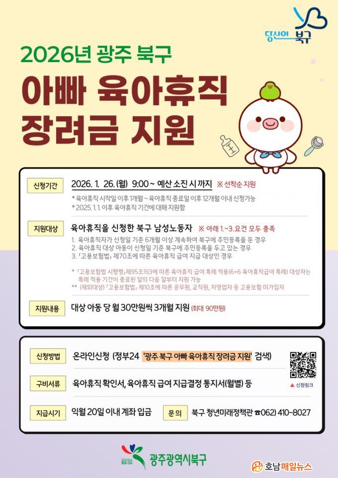 25ÀÏ ºÏ±¸¿¡ µû¸£¸é ¿À´Â 26ÀϺÎÅÍ ¡®2026³â ¾Æºü À°¾ÆÈÞÁ÷ Àå·Á±Ý¡¯ ½ÅûÀÌ ½ÃÀ۵ȴÙ. À̹ø »ç¾÷Àº ¾çÀ° Ä£È È¯°æÀ» Á¶¼ºÇϰí ÈÞÁ÷¿¡ µû¸¥ °æÁ¦Àû ºÎ´ãÀ» ¿ÏÈÇϱâ À§ÇØ Áö³ÇØ ºÏ±¸°¡ ±¤ÁÖ¿¡¼ óÀ½À¸·Î ½ÃÇàÇÑ À°¾Æ Áö¿ø Á¤Ã¥ÀÌ´Ù.
