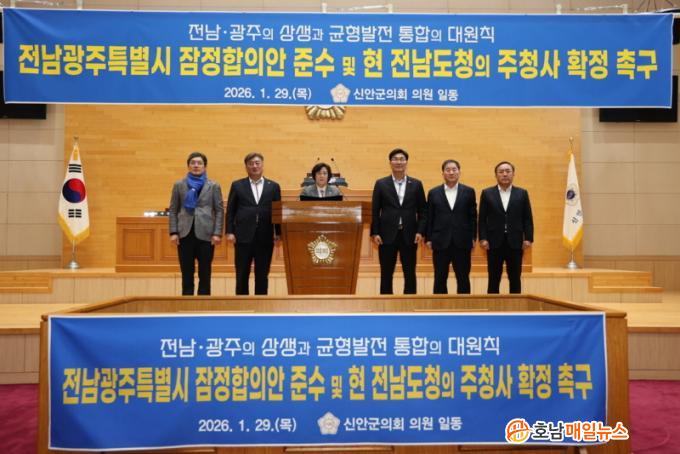 ½Å¾È±ºÀÇȸ´Â À̹ø °áÀǹ®À» ÅëÇØ ¡°Àü³²¡¤±¤ÁÖ ÇàÁ¤ÅëÇÕÀº ¼öµµ±Ç ÁýÁß°ú Áö¹æ¼Ò¸ê À§±â¿¡ ´ëÀÀÇϱâ À§ÇÑ Àü·«Àû ¼±Åá±À̶ó¸ç, ¡°ÅëÇÕ¿¡ ´ëÇÑ ½Å·Ú¸¦ Áö۱â À§Çؼ´Â Àü³²±¤ÁÖÆ¯º°½ÃÀÇ ÇàÁ¤ Áß½ÉÀ» Çö Àü¶ó³²µµÃ» ¼ÒÀçÁö¿¡ ¸íÈ®È÷ µÎ´Â °ÍÀÌ ÃÖ¼ÒÇÑÀÇ Ãâ¹ßÁ¡¡±À̶ó°í °Á¶Çß´Ù.