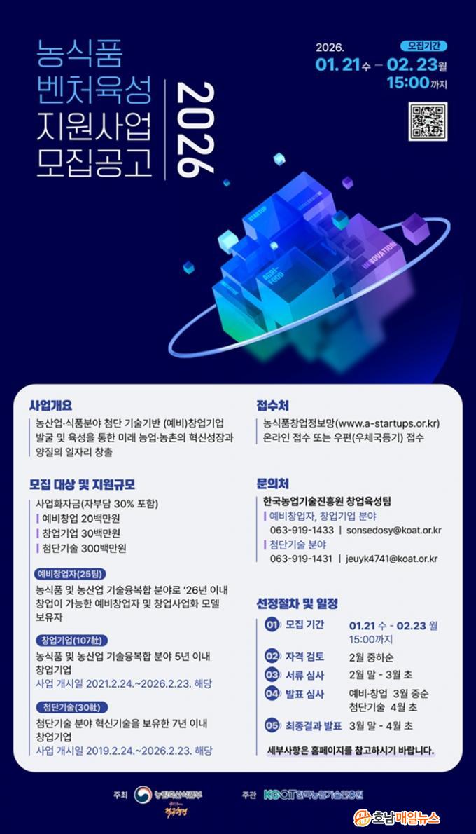 2026³â ³ó½Äǰ º¥Ã³À°¼º Áö¿ø»ç¾÷Àº ³ó½Äǰ ºÐ¾ß ¿¹ºñâ¾÷ÀÚ¿Í Ã¢¾÷ Ãʱ⠱â¾÷, ÷´Ü±â¼úÀ» Á¢¸ñÇÑ À¯¸Á º¥Ã³±â¾÷À» ´ë»óÀ¸·Î »ç¾÷È Àڱݰú ¼ºÀå Áö¿øÀ» Á¦°øÇÏ´Â »ç¾÷ÀÌ´Ù. ¿À´Â 23ÀϱîÁö ³ó½Äǰâ¾÷Á¤º¸¸Á(www.a-startups.or.kr)¿¡ Á¢¼öÇÏ¸é µÈ´Ù.