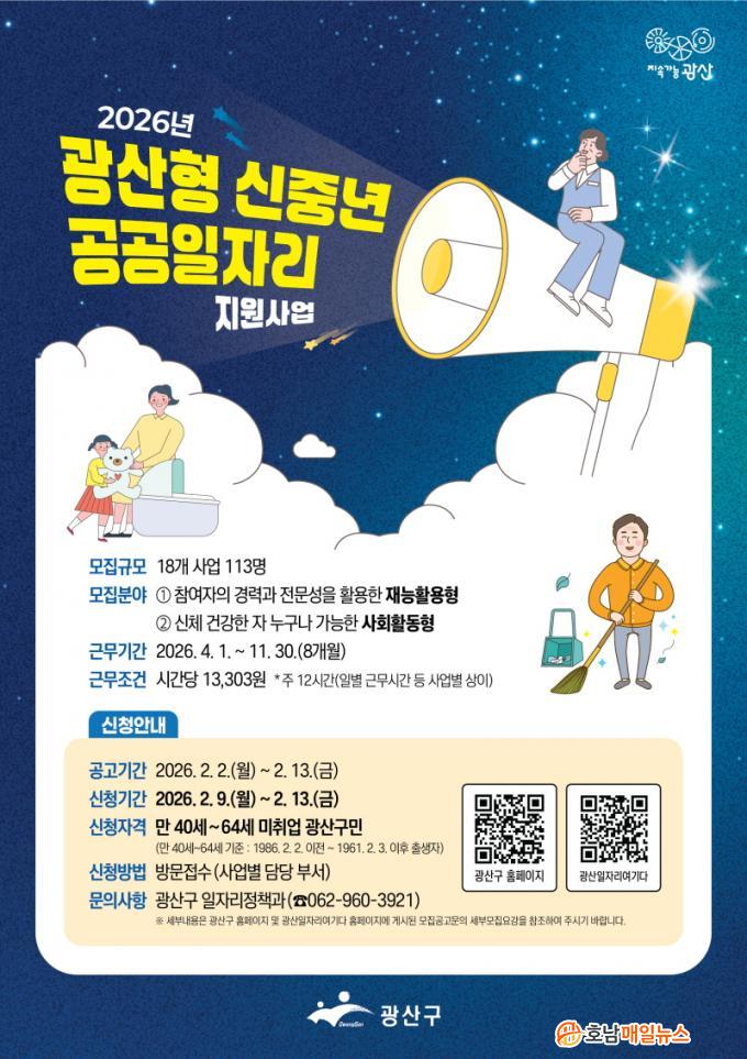 ±¤»ê±¸´Â 2°³ ºÐ¾ß 18°³ »ç¾÷¿¡¼ 8°³¿ù°£ Ȱµ¿ÇÒ 113¸íÀÇ Âü¿©ÀÚ¸¦ ¸ðÁýÇÑ´Ù. ½Åû ±â°£Àº 9ÀϺÎÅÍ 13ÀϱîÁö °¢ ÀÏÀÚ¸® ´ã´ç ºÎ¼¿¡ ¹æ¹®ÇÏ¸é µÇ¸ç, °ø°øÀÏÀÚ¸® °ü·ÃÇÑ ÀÚ¼¼ÇÑ »çÇ×Àº ±¤»ê±¸ ´©¸®ÁýÀ̳ª ±¤»ê±¸ ÀÏÀÚ¸® ÅëÇÕÇ÷§Æû(±¤»ê ÀÏÀÚ¸® ¿©±â´Ù) ´©¸®Áý¿¡¼ È®ÀÎÇÒ ¼ö ÀÖ´Ù.