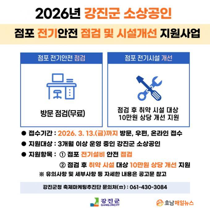 Áö¿ø ´ë»óÀº °Áø±º¿¡ »ç¾÷ÀÚµî·Ï°ú »ç¾÷Àå ÁÖ¼Ò¸¦ µÎ°í °ø°íÀÏ ±âÁØ 3°³¿ù ÀÌ»ó ¿µ¾÷ ÁßÀÎ ¼Ò»ó°øÀÎÀÌ´Ù. ¼±Á¤ ½Ã Á¡Æ÷¿¡ Á÷Á¢ ã¾Æ°¡¼ Àü±â¼³ºñ°¡ ¾ÈÀüÇÑÁö Á¡°ËÇϰí Ãë¾à ºÎºÐ ¹ß°ß ½Ã 10¸¸ ¿ø »ó´çÀ¸·Î Ãë¾àºÎºÐÀ» °³¼±ÇÒ ¼ö ÀÖµµ·Ï Áö¿ø ÇÒ ¿¹Á¤ÀÌ´Ù.