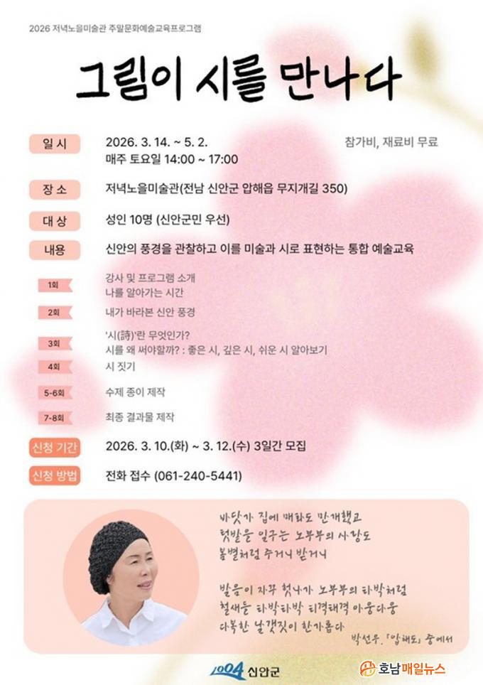 ¸ÅÁÖ Åä¿äÀÏ ¿ÀÈÄ 2½ÃºÎÅÍ 5½Ã±îÁö Àú³á³ëÀ»¹Ì¼ú°ü¿¡¼ ÁøÇàµÇ´Â À̹ø ÇÁ·Î±×·¥Àº ½Å¾ÈÀÇ Ç³°æÀ» °üÂûÇϰí À̸¦ ±×¸²°ú ½Ã·Î Ç¥ÇöÇÏ´Â ÅëÇÕ ¿¹¼ú Á᫐ ±³À°ÀÌ´Ù.