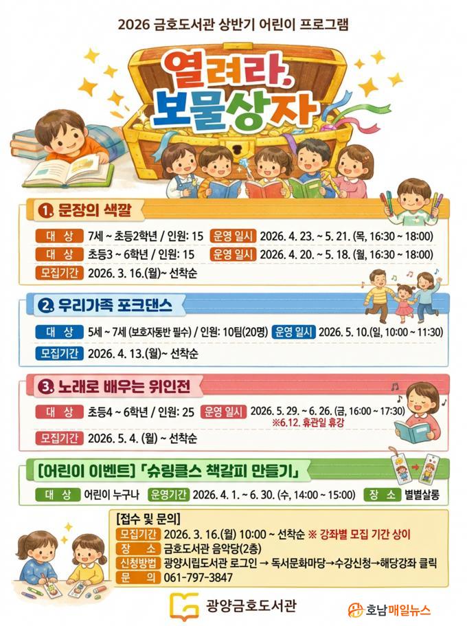 ÇÑÆí, 2026³â ±ÝÈ£µµ¼°ü »ó¹Ý±â ¾î¸°ÀÌ ÇÁ·Î±×·¥°ú °ü·ÃÇÑ ÀÚ¼¼ÇÑ »çÇ×Àº ±¤¾ç½Ã¸³µµ¼°ü ´©¸®Áý(http://lib.gwangyang.go.kr)¿¡¼ È®ÀÎÇϰųª ±ÝÈ£µµ¼°ü(¢Ï061-797-3847)À¸·Î ¹®ÀÇÇÏ¸é ¾È³»¹ÞÀ» ¼ö ÀÖ´Ù.