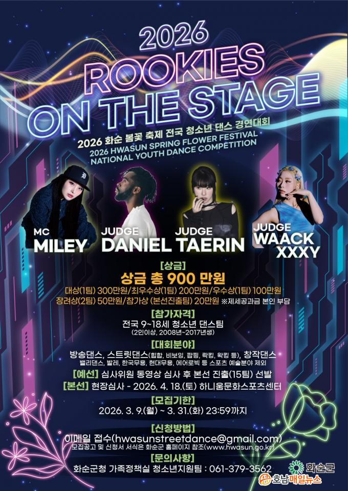 °æ¿¬ Á¾¸ñÀº ¹æ¼Û´í½º, ½ºÆ®¸®Æ®´í½º, âÀÛ´í½º Áß ÀÚÀ¯·Ó°Ô ¼±ÅÃÇÒ ¼ö ÀÖ´Ù. Á¢¼ö ±â°£Àº 2026³â 3¿ù 31ÀϱîÁöÀ̸ç, Âü°¡ ½Åû¼¿Í ´í½º µ¿¿µ»óÀ» À̸ÞÀÏ(hwasunstreetdance@gmail.com)·Î Á¦ÃâÇÏ¸é µÈ´Ù. ±âŸ ÀÚ¼¼ÇÑ »çÇ×Àº ȼø±º ȨÆäÀÌÁö °í½Ã °ø°í¶õÀ» È®ÀÎÇÏ¸é µÈ´Ù.
