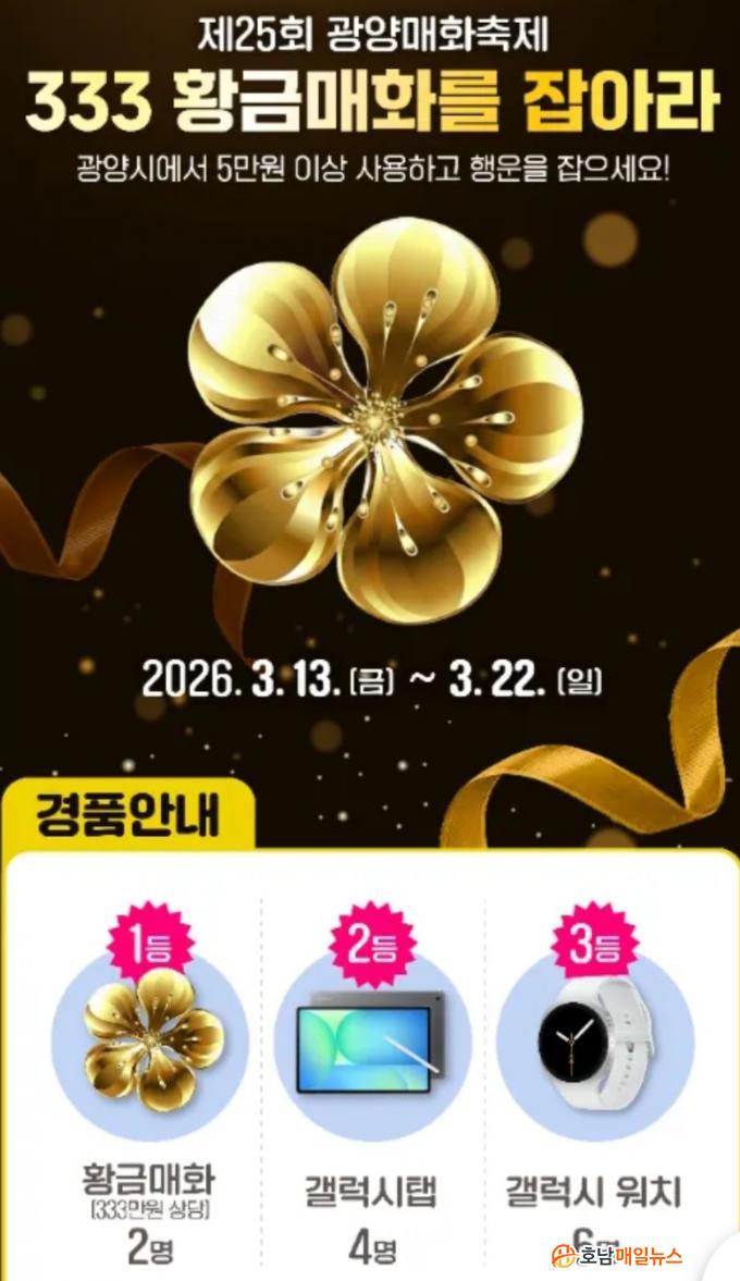 ±¤¾ç½Ã´Â ÃàÁ¦ ±â°£ µ¿¾È ÃÑ 333¸¸ ¿ø »ó´çÀÇ È²±Ý¸Åȸ¦ ¹ÞÀ» ¼ö ÀÖ´Â ¡®È²±Ý¸ÅÈ¡¤¸Å½Ç GET¡¯ À̺¥Æ®¸¦ ºñ·ÔÇØ ¡®Çѱ¹°ü±¤ 100¼± Ž¹æ¡¯, ¡®±¤¾ç¸ÅÈ ½ºÅÆÇÁ Åõ¾î¡¯, ¡®¸ÅÈ±æ °¡º¿î °ÉÀ½(Fun Run)¡¯ µî Âü¿©Çü ÇÁ·Î±×·¥À» ¿î¿µÇÑ´Ù°í ¹àÇû´Ù.
