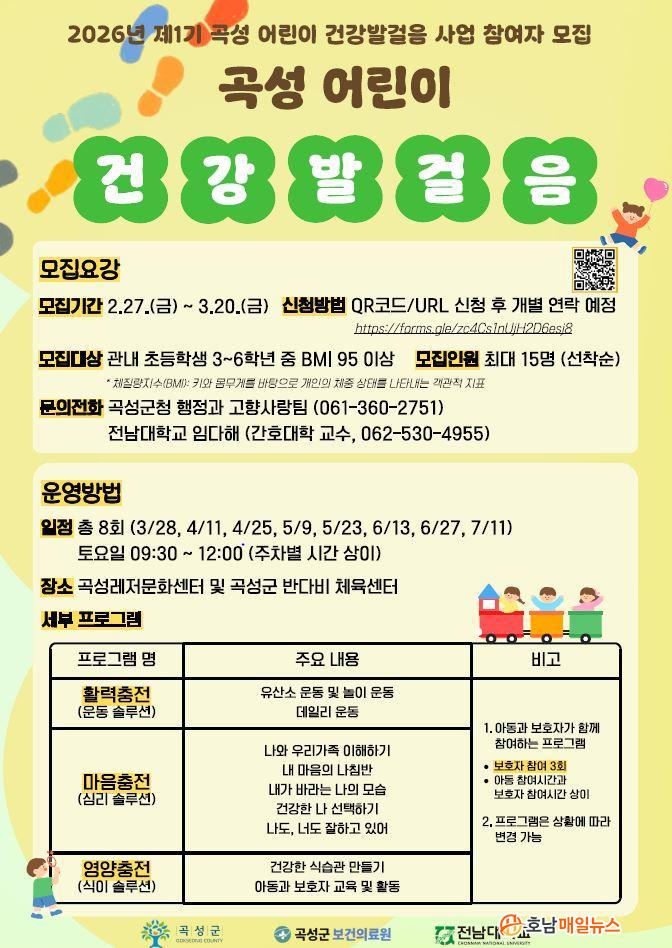 ¸ðÁý ´ë»óÀº °ü³» ÃʵîÇб³ 3ÇгâºÎÅÍ 6Çгâ±îÁö Çлý Áß Ã¼Áú·®Áö¼ö(BMI) 95 ÀÌ»ó ¾î¸°ÀÌÀ̸ç, ÇÁ·Î±×·¥Àº 3¿ùºÎÅÍ 7¿ù±îÁö ÃÑ 8ȸ¿¡ °ÉÃÄ ÁöÁ¤µÈ Åä¿äÀÏ ¿ÀÀü¿¡ ÁøÇàµÈ´Ù. ¿î¿µ Àå¼Ò´Â °î¼º·¹Àú¹®È¼¾ÅÍ¿Í °î¼º±º¹Ý´ÙºñüÀ°¼¾ÅÍ·Î, ¾î¸°À̵éÀÌ ¾ÈÀüÇϰí ÄèÀûÇÑ È¯°æ¿¡¼ ÇÁ·Î±×·¥¿¡ Âü¿©ÇÒ ¼ö ÀÖµµ·Ï ÇÒ ¿¹Á¤ÀÌ´Ù.