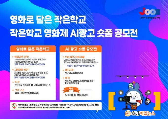 Àü¶ó³²µµ±³À°Ã»Àº ÀÛÀºÇб³ ±³À°°æÀï·ÂÀ» ³ôÀ̰í ÇлýµéÀÇ Ã¢ÀÇÀû Ç¥Çö ¿ª·®À» Ű¿ì±â À§ÇØ ±Û·ÎÄà ÀÛÀºÇб³ ¿µÈ Ư¼ºÈ ±³À°À» ÃßÁøÇÏ°í ¡®¿µÈ·Î ´ãÀº ÀÛÀºÇб³¡¯ »ç¾÷°ú ¡®ÀÛÀºÇб³ ¿µÈÁ¦ AI ±¤°í ¼ôÆû °ø¸ðÀü¡¯À» ¿î¿µÇÑ´Ù°í ¹àÇû´Ù.