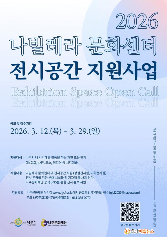 ³ªÁÖ¹®ÈÀç´ÜÀº ¿À´Â 3¿ù 29ÀϱîÁö Áö¿ª ½Ã°¢¿¹¼ú ÀÛ°¡¿Í ´Üü¸¦ ´ë»óÀ¸·Î ³ªºô·¹¶ó¹®È¼¾ÅÍ ³» Àü½Ã°ø°£À» ¹«»óÀ¸·Î Áö¿øÇÏ´Â °ø¸ð»ç¾÷À» ÁøÇàÇÑ´Ù°í 13ÀÏ ¹àÇû´Ù.