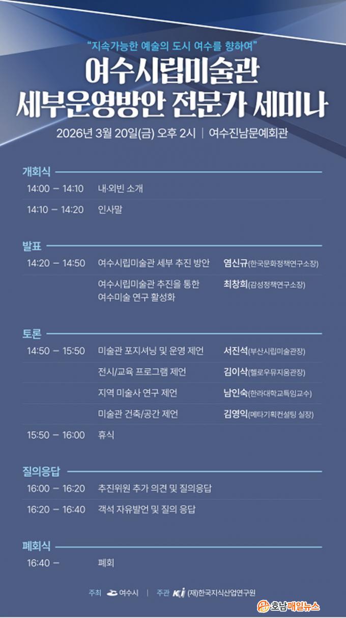 ¿©¼ö½Ã´Â À̹ø ¼¼¹Ì³ª¸¦ ÅëÇØ Áö¿ª ¹®È¿¹¼ú ȯ°æ¿¡ ºÎÇÕÇÏ´Â ¹Ì¼ú°ü ¿î¿µ ¸ðµ¨À» ¹ß±¼Çϰí ÇâÈÄ ¿©¼ö½Ã¸³¹Ì¼ú°üÀÌ Áö¿ª ¿¹¼ú ¿¬±¸¿Í ½Ã¹Î ¹®È ÇâÀ¯ÀÇ Á᫐ °ø°£À¸·Î ÀÚ¸®¸Å±èÇÒ ¼ö ÀÖµµ·Ï Á¤Ã¥Àû ±â¹ÝÀ» ¸¶·ÃÇÒ ¹æÄ§ÀÌ´Ù.