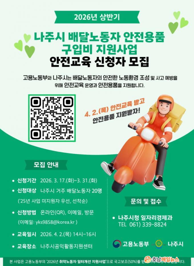 ³ªÁֽô ¹è´Þ³ëµ¿ÀÚÀÇ ¾ÈÀüÇÑ ³ëµ¿È¯°æ Á¶¼ºÀ» À§ÇØ ¹è´Þ³ëµ¿ÀÚ ¾ÈÀü¿ëǰ ±¸ÀÔºñ Áö¿ø»ç¾÷À» ÃßÁøÇϰí ÀÌ·ûÂ÷ ±³Åë¾ÈÀü±³À°À» ½Ç½ÃÇÑ´Ù°í 18ÀÏ ¹àÇû´Ù.