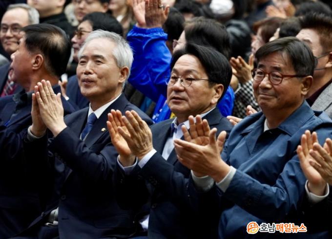 ° È帴 ¡°¿¬¼³È¸¿¡ ÇÔ²²ÇÑ ¸ðµÎ°¡ °°Àº ÆÄ¶õ»öÀÌÁö¸¸, ¶È°°Áö´Â ¾Ê´Ù¡±¶ó¸ç ¡°´Ù¾çÇÑ ¸ñ¼Ò¸®°¡ ¾î¿ì·¯Á® ¸¸µé¾îÁö´Â ÆÄ¶õ»ö, ±×°ÍÀÌ ¹ÎÁÖ´çÀÇ »ö, ¹ÎÁÖ´çÀÇ Èû¡±À̶ó°í °Á¶Çß´Ù. ÀÌ¾î ¡°Áö³ 4³â°£ 5°³ ±¸Ã»°ú Çù·ÂÇØ ¸¹Àº ¼º°ú¸¦ ¸¸µé¾î¿Ô´Ù¡±¸ç ¡°ÀÌ¹Ì ½ÃÀÛµÈ »ç¾÷µéÀÌ ¼º°øÀûÀ¸·Î ¿Ï¼öµÇ°í »õ·Î¿î ºñÀüÀÌ Çö½ÇÀÌ µÉ ¼ö ÀÖµµ·Ï Áß´Ü ¾ø´Â ¹ßÀüÀ» ÀÌ·ç°Ú´Ù¡±°í ¹àÇû´Ù.