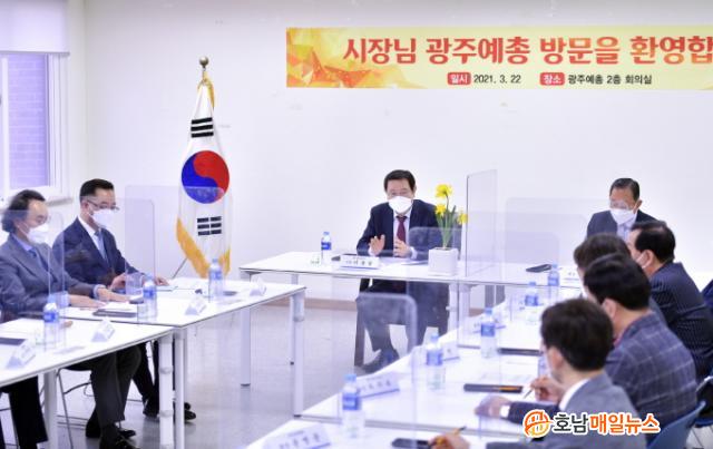 À̳¯ ÀÌ ½ÃÀåÀº ±¤ÁÖ¿¹ÃÑȸ°üÀ» ¹æ¹®ÇØ ÀÓ¿ø½Ä ±¤ÁÖ¿¹ÃÑ È¸ÀåÀ» ºñ·ÔÇØ 10°³ ÇùȸÀåµé°ú °£´ãȸ¸¦ °®°í Äڷγª19·Î Å« Ÿ°ÝÀ» ÀÔÀº ¹®È¿¹¼ú°èÀÇ °íÃæÀ» ûÃëÇÏ°í ´ëÃ¥ µîÀ» ³íÀÇÇß´Ù.