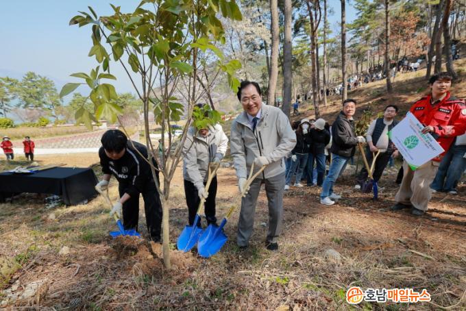 ¿Ïµµ¸¦ »ó¡ÇÏ´Â ³ª¹« ½ÄÀç·Î »ç°èÀý ³ì»ö °æ°üÀ» À¯ÁöÇϰí ź¼Ò Èí¼ö ±â´ÉÀ» °ÈÇÔÀ¸·Î½á »ê¸²ÀÇ »ó¡Àû¡¤°æ°üÀû¡¤»ýÅÂÀû °¡Ä¡¸¦ ³ôÀÏ ¼ö ÀÖÀ» °ÍÀ¸·Î ±â´ëµÈ´Ù. ½ÄÀç ÈÄ ¿ÀÈÄ¿¡´Â ¿ÏµµÇØÁ¶·ù¼¾ÅÍ ±¤Àå¿¡¼ ±º¹Î 800¿© ¸íÀ» ´ë»óÀ¸·Î Ȳĥ³ª¹«, öÂß, ¾Ö±âµ¿¹é³ª¹« µî 2,400º»ÀÇ ¹Ý·Á ³ª¹«¸¦ ³ª´³´Ù.