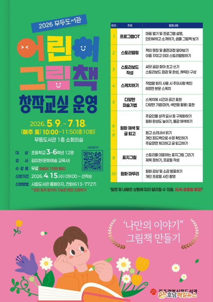 âÀÛ±³½ÇÀº 5¿ù 9ÀϺÎÅÍ 7¿ù 18ÀϱîÁö ¸ÅÁÖ Åä¿äÀÏ ¹«µîµµ¼°ü¿¡¼ ÁøÇàµÈ´Ù. Âü°¡ ½ÅûÀº 4¿ù15ÀϺÎÅÍ ½Ã¸³µµ¼°ü ´©¸®Áý(https://citylib.gwangju.go.kr)¿¡¼ ¼±Âø¼ø Á¢¼öÇϸç, ÀÚ¼¼ÇÑ »çÇ×Àº ¹«µîµµ¼°ü(062-613-7727)À¸·Î ¹®ÀÇÇÏ¸é µÈ´Ù.