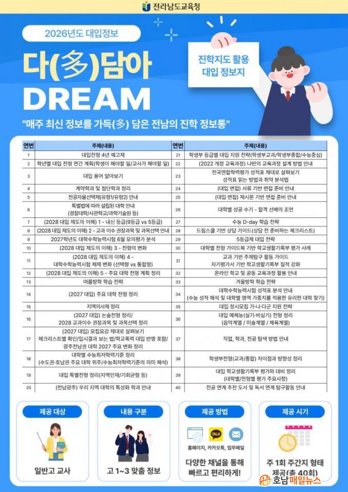 Á¤º¸Áö´Â ÁÖ°£ ´ÜÀ§·Î Á¦ÀÛµÇ¾î ´©¸®Áý, īī¿ÀÅå ´Üü¹æ, ¾÷¹« ¸ÞÀÏ µîÀ» ÅëÇØ Á¦°øµÈ´Ù. ¶ÇÇÑ Çб³ ÇöÀå¿¡¼ ¹Ù·Î Ȱ¿ëÇÒ ¼ö ÀÖµµ·Ï ÇÙ½É ³»¿ëÀ» À籸¼ºÇϰí, ½Ã±âº° ÀԽà À̽´¿Í ¿¬°èÇÑ ÁøÇÐ Á᫐ ÀÚ·á·Î °³¹ßµÈ´Ù.