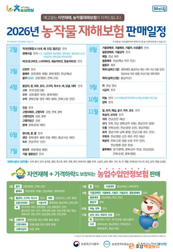 ³óÀÛ¹°ÀçÇØº¸ÇèÀº ÅÂdz¡¤¿ì¹Ú µî ÀÚ¿¬ÀçÇØ¿¡ µû¸¥ ³óÀÛ¹° ÇÇÇØ¸¦ º¸ÀåÇÏ´Â Á¦µµ´Ù. °¡ÀÔ ´ë»óÀº ³ó¾÷°æ¿µÃ¼¿¡ µî·ÏµÈ ³ó¾÷Àΰú ³ó¾÷¹ýÀÎÀÌ¸ç º, ¹èÃß µî ÃÑ 78°³ ǰ¸ñ¿¡ °¡ÀÔÇÒ ¼ö ÀÖ´Ù.
