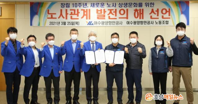 25ÀÏ ¿ùµå¸¶¸°¼¾ÅÍ¿¡¼ ¿¸° ¿©¼ö±¤¾çÇ׸¸°ø»ç ¡®Ã¢¸³ 10Áֳ⠻õ·Î¿î ³ë»ç»ó»ý ¹®È¸¦ À§ÇÑ ³ë»ç°ü°è ¹ßÀüÀÇ ÇØ ¼±¾ð½Ä¡¯¿¡¼ Â÷¹Î½Ä »çÀå(»çÁø ¿ÞÂÊ ´Ù¼¸ ¹øÂ°)°ú ³²Ã¶Èñ ¿©¼ö±¤¾çÇ׸¸°ø»ç³ëµ¿Á¶ÇÕ À§¿øÀåÀÌ Âü¼®ÀÚµé°ú ±â³äÃÔ¿µÀ» Çϰí ÀÖ´Ù.