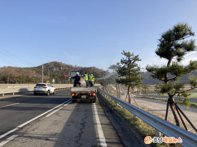 À̹ø º´ÇØÃæ ¹æÁ¦´Â ¸ÕÀú ±¹µµ 13È£¼±(¼Ò³ª¹« 1,114ÁÖ), ±ºµ¿ È£°è¸®~ÀÛõ~¼ºÀü ǮġÀç(º¢³ª¹« 3,878ÁÖ), ±¹µµ 2È£¼±(°¡½Ã³ª¹« 3,406ÁÖ) µî ÃÑ 95km ±¸°£¿¡ ½ÄÀçµÈ °¡·Î¼ö 14,477±×·ç¿¡ »ìÃæ¡¤»ì±ÕÁ¦¿Í ¿µ¾çÁ¦¸¦ È¥ÇÕ Â÷·®¿¡ ÀÇÇÑ Áö»óºÎ »ìÆ÷ ¹æ½ÄÀ¸·Î ÁøÇàÇÑ´Ù.