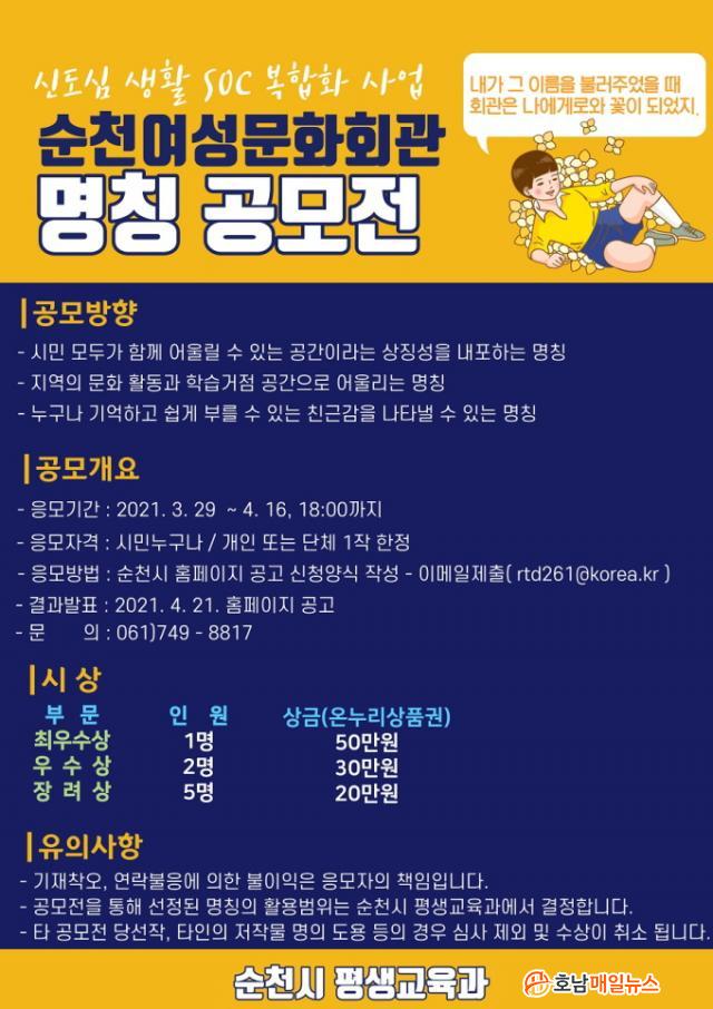 °ø¸ð½ÅûÀº ¼øÃµ½Ã ȨÆäÀÌÁö¿¡¼ ÀÀ¸ð½Åû¼¸¦ ³»·Á ¹Þ¾Æ ¸íΰú ±× Àǹ̸¦ ÀÛ¼ºÇÏ¿© 4¿ù 16ÀϱîÁö ÀüÀÚ¿ìÆíÀ» ÅëÇØ Á¢¼öÇÏ¸é µÈ´Ù. ¼øÃµ½Ã¹Î ´©±¸³ª Âü¿©°¡´ÉÇϸç Á¦¾ÈµÈ ¸íĪ¿¡ ´ëÇØ ½É»ç¸¦ °ÅÃÄ ÃÖ¿ì¼ö 1¸í 50¸¸¿ø, ¿ì¼ö 2¸í °¢ 30¸¸¿ø, Àå·Á 5¸í °¢ 20¸¸¿ø Áö±ÞÇÒ °èȹÀÌ´Ù. ¼±Á¤ °á°ú´Â ´ÙÀ½´Þ 21ÀÏ¿¡ ¹ßÇ¥ÇÑ´Ù.