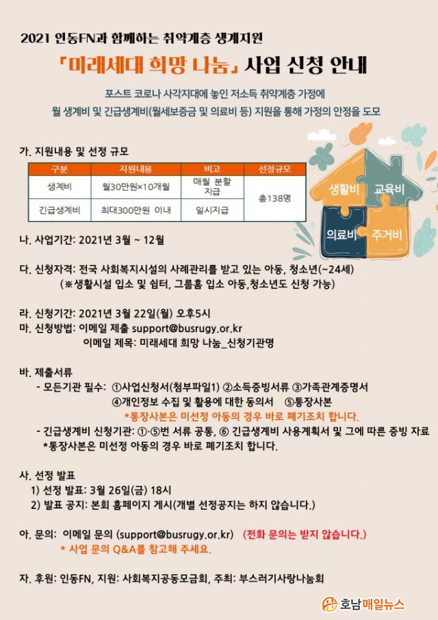 Àε¿FN°ú ÇÔ²²ÇÏ´Â Ãë¾à°èÃþ »ý°èÁö¿ø ¡®¹Ì·¡¼¼´ë Èñ¸Á ³ª´®¡¯ »ç¾÷Àº Äڷγª·Î »ç°¢Áö´ë¿¡ ³õÀÎ Àú¼Òµæ Ãë¾à°èÃþ °¡Á¤¿¡ ¿ù »ý°èºñ¿Í ±ä±Þ »ý°èºñ¸¦ Áö¿øÇÏ´Â »ç¾÷ÀÌ´Ù. Àü±¹¿¡¼ ÃÑ 138¸íÀ» ¼±Á¤ÇØ 1Àδç 300¸¸ ¿øÀÇ »ý°èºñ¸¦ Áö¿øÇÑ´Ù.