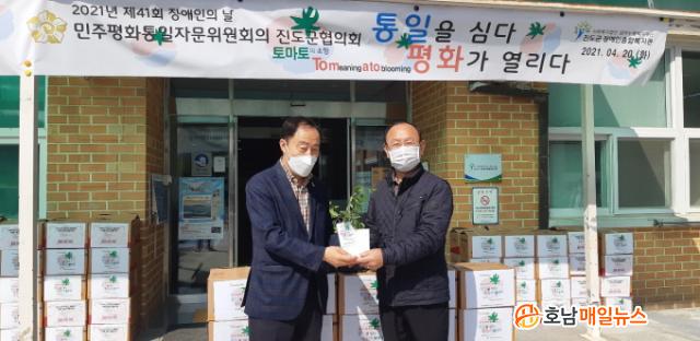 Á¦41ȸ Àå¾ÖÀÎÀÇ ³¯À» ¸Â¾Æ ¹ÎÁÖÆòÈÅëÀÏÀÚ¹®À§¿øÈ¸ÀÇ Áøµµ±ºÇùÀÇȸ°¡ Á¤¼Áö¿ø »ç¾÷ÀÇ ÀÏȯÀ¸·Î ÆòÅëÀ§¿øµéÀÇ ¼º±Ý 100¿©¸¸¿øÀ¸·Î ¡®Çູ Å丶Åä ¸ðÁ¾¡¯À» ±¸ÀÔ, Àå¾ÖÀεéÀÌ °¡Á¤¿¡¼ Ű¿ï ¼ö ÀÖ´Â Å丶Åä ¸ðÁ¾À» Àü´ÞÇß´Ù.