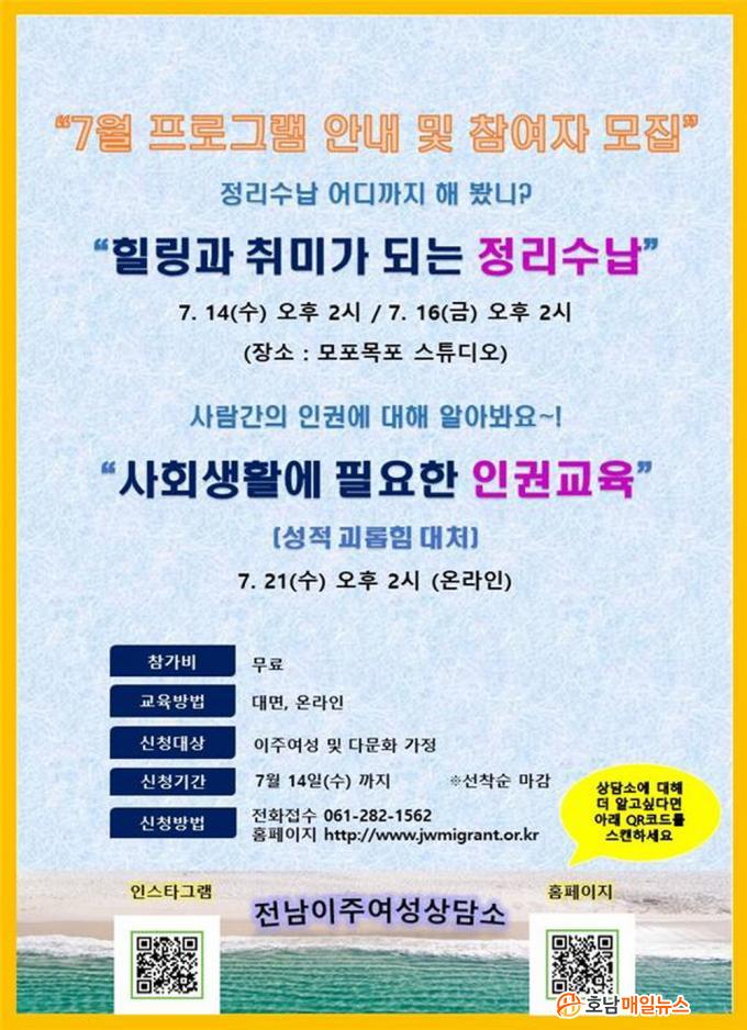 º» ÇÁ·Î±×·¥Àº ¹«·áÀ̸ç, ÀÌÁÖ¿©¼ºÀ̶ó¸é ´©±¸³ª Âü¿©°¡ °¡´ÉÇÏ´Ù. ½ÅûÀº 7¿ù 14ÀϱîÁö Àü³²Æø·ÂÇÇÇØÀÌÁÖ¿©¼º»ó´ã¼Ò ȨÆäÀÌÁö(www.jwmigrant.or.kr)¿Í ÀüÈ(061-282-1562)·Î Á¢¼öÇÒ ¼ö ÀÖ´Ù.