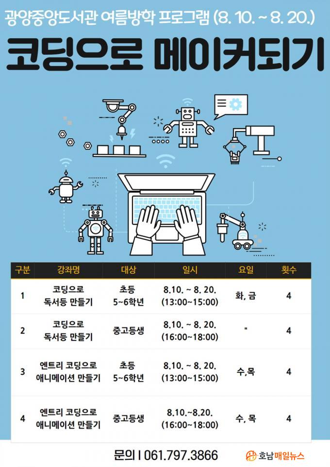 ÇÑÆí, ÇÁ·Î±×·¥ ¼ö° ½ÅûÀº ¿À´Â 7¿ù 28ÀÏ ¼ö¿äÀÏ ¿ÀÀü 10½ÃºÎÅÍ ±¤¾ç½Ã¸³µµ¼°ü ȨÆäÀÌÁö(lib.gwangyang.go.kr)¿¡¼ °¡´ÉÇϰí, ±Ã±ÝÇÑ »çÇ×Àº ±¤¾çÁß¾Óµµ¼°ü(¢Ï061-797-3866)À¸·Î ¹®ÀÇÇÏ¸é ¾Ë ¼ö ÀÖ´Ù.