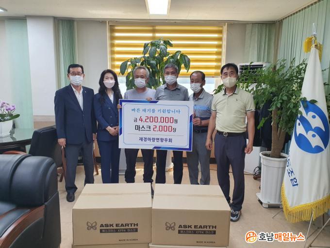 Àç°æ ¸¶·®¸éÇâ¿ìȸ(ȸÀå ¹Ú»ó¿ë)´Â ¹Ú¹ü¼® °Áø±º¼öÇùÀå, °ÇѼº ¸¶·®¸éÀå µî°ú ÇÔ²² ÇÇÇØ ¾î°¡¸¦ ¹æ¹®ÇØ Çâ¿ìµéÀÌ ½Ê½ÃÀϹÝÀ¸·Î ¸ðÀº º¹±¸ºñ 420¸¸ ¿ø°ú ¸¶½ºÅ© 2,000ÀåÀ» Àü´ÞÇß´Ù.
