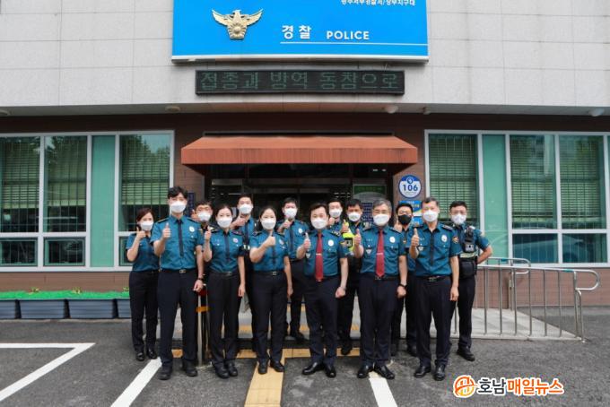ÇÑÆí, ±èÁØÃ¶ ûÀåÀº ǥâÀ» ¼ö¿©ÇÑ Á÷ÈÄ ¼øÂûÆÀ°ú °£´ãȸ¸¦ °®°í, ¾ÕÀ¸·Îµµ Áֹεé°ú ¹ÐÁ¢ÇÏ°Ô ¼ÒÅëÇÏ¿© Áö¿ª Ä¡¾ÈºÒ¾È¿äÀÎÀ» ÇØ¼ÒÇØÁÖ±æ ´çºÎÇϸç ÇöÀå Áö¿ª°æÂû°üµéÀÇ ³ë°í¸¦ Ä¡ÇÏÇÏ¿´´Ù.