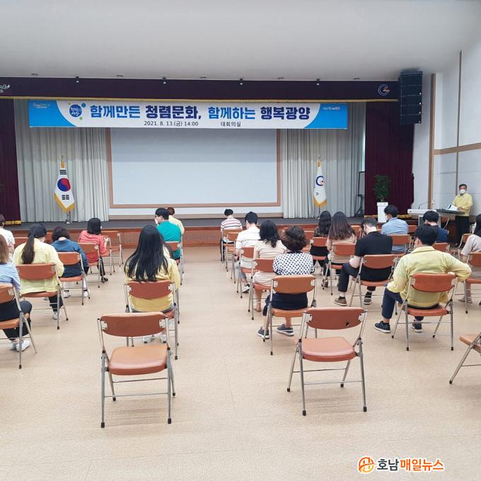 ÇÑÆí, ÀÌ»ï½Ä °¨»ç½ÇÀåÀº ¡°¡®ôèÖ¯(û·Å)¡¯Àº ¡®¼ºÇ°°ú Çà½ÇÀÌ ³ô°í ¸¼À¸¸ç, Ž¿åÀÌ ¾øÀ½¡¯À̶ó´Â ¶æÀ» Á÷¿øµé¿¡°Ô °¢ÀνÃ۰í, ±¤¾ç½ÃÀÇ ¸ðµç °øÁ÷ÀÚ°¡ û·Å ¸®´õ°¡ µÇµµ·Ï ´õ¿í Èû½á ÁÖ½Ã±æ ºÎŹµå¸°´Ù¡±°í ¸»Çß´Ù.