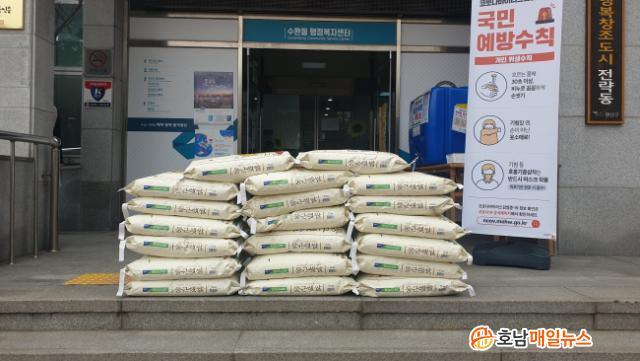 [È£³²¸ÅÀÏ´º½º = ÀÌÁ¾¹é ±âÀÚ] Äڷγª19¸¦ ÇÔ²² ±Øº¹ÇÏÀÚ´Â ±âºÎ°¡ ±¤»ê±¸ °÷°÷¿¡¼ À̾îÁö°í ÀÖ´Â °¡¿îµ¥, 6ÀÏ ¿ÀÈÄ ¼ö¿Ïµ¿ ÇàÁ¤º¹Áö¼¾ÅÍ¿¡ ¡®Äڷγª19·Î ¾î·Á¿î ÀÌ¿ôÀ» µµ¿Í´Þ¶ó¡¯´Â ÂÊÁö¿Í ÇÔ²² 20kgµéÀÌ ½Ò 20Æ÷°¡ À͸íÀ¸·Î ¹è´ÞµÆ´Ù.