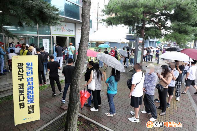 »çÁø¼³¸í=Áö³ 23ÀÏ ¿Ü±¹ÀÎÁֹεéÀÌ Äڷγª19 ¹é½Å Á¢Á¾À» À§ÇÑ °ü¸®¹øÈ£¸¦ ¹ß±Þ ¹Þ±â À§ÇØ ±¤»ê±¸Ã» ¾Õ¿¡ ÁÙÀ» ¼ ÀÖ´Â ¸ð½À.