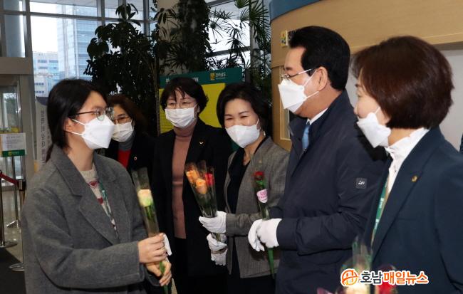 µµÃ»¿¡¼ ¸¶·ÃµÈ À̳¯ Çà»ç´Â Ãâ±ÙÇÑ Á÷¿øµé¿¡°Ô Àå¹Ì²É°ú ¶±À» ÁõÁ¤ÇÏ°í ¿©¼ºÆø·Â OUT, ¼ºÆòµîÇÑ Á÷Àå¹®È Á¶¼º µî ½½·Î°ÇÀ» ¿ÜÄ¡¸ç ¿©¼ºÀÇ ³¯ Àǹ̸¦ µÇ»õ±ä ½Ã°£ÀÌ µÆ´Ù.