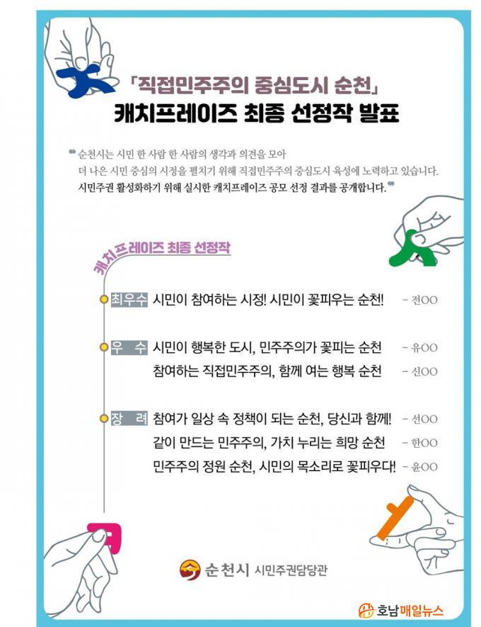 ¿ì¼öÀÛ¿¡´Â ¡®½Ã¹ÎÀÌ ÇູÇÑ µµ½Ã, ¹ÎÁÖÁÖÀǰ¡ ²ÉÇÇ´Â ¼øÃµ¡¯, ¡®Âü¿©ÇÏ´Â Á÷Á¢¹ÎÁÖÁÖÀÇ, ÇÔ²²¿©´Â Çູ ¼øÃµ¡¯, Àå·ÁÀÛ¿¡´Â ¡®Âü¿©°¡ ÀÏ»ó ¼Ó Á¤Ã¥ÀÌ µÇ´Â ¼øÃµ, ´ç½Å°ú ÇÔ²²!¡¯, ¡®°°ÀÌ ¸¸µå´Â ¹ÎÁÖÁÖÀÇ, °¡Ä¡ ´©¸®´Â Èñ¸Á ¼øÃµ¡¯, ¡®¹ÎÁÖÁÖÀÇ Á¤¿ø ¼øÃµ, ½Ã¹ÎÀÇ ¸ñ¼Ò¸®·Î ²ÉÇÇ¿ì´Ù!¡¯°¡ ¼±Á¤µÆ´Ù.