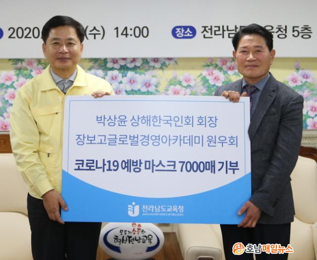 À庸°í±Û·Î¹úÀç´Ü ³» À庸°í°æ¿µ¾ÆÄ«µ¥¹Ì ±è°©¼ö ȸÀå°ú »óÇØÇѱ¹ÀÎȸ ¹Ú»óÀ± ȸÀåÀº 18ÀÏ(¼ö) ¿ÀÈÄ Àü¶ó³²µµ±³À°Ã»À» ¹æ¹®, Àå¼®¿õ ±³À°°¨¿¡°Ô Àü³² ¾ÆÀ̵éÀÇ Äڷγª19 ¿¹¹æÈ°µ¿¿¡ ½á´Þ¶ó¸ç ¸¶½ºÅ© 7,000¸Å¸¦ Àü´ÞÇß´Ù.