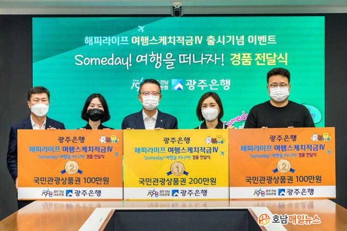 ¡®ÇØÇǶóÀÌÇÁ ¿©ÇེÄÉÄ¡Àû±Ý ¥³¡¯ Ãâ½Ã¸¦ ±â³äÇØ Áö³ 8¿ù 31ÀϱîÁö ÁøÇàÇÑ ¡®SOMEDAY ¿©ÇàÀ» ¶°³ªÀÚ¡¯ À̺¥Æ®´Â ±¤ÁÖÀºÇà ¿©Çà 3Á¾ »óǰ(ÇØÇǶóÀÌÇÁ ¿©ÇེÄÉÄ¡Àû±Ý ¥³¡¤¿©ÇེÄÉÄ¡¿ÜÈÀû±Ý¡¤¿©ÇེÄÉġüũīµå)À» °¡ÀÔÇÑ °í°´À» ´ë»óÀ¸·Î Ãß÷À» ÅëÇØ 1µî 1¸í¿¡°Ô´Â ¿©Çà»óǰ±Ç 200¸¸¿ø, 2µî 2¸í¿¡°Ô´Â ¿©Çà»óǰ±Ç 100¸¸¿ø, 3µî 100¸í¿¡°Ô´Â ÁÖÀ¯»óǰ±Ç 3¸¸¿ø±ÇÀ» Á¦°øÇß´Ù. ´ç÷ÀÚ´Â ±¤ÁÖÀºÇà ȨÆäÀÌÁö(www.kjbank.com)¿¡¼ È®ÀÎ °¡´ÉÇÏ´Ù.