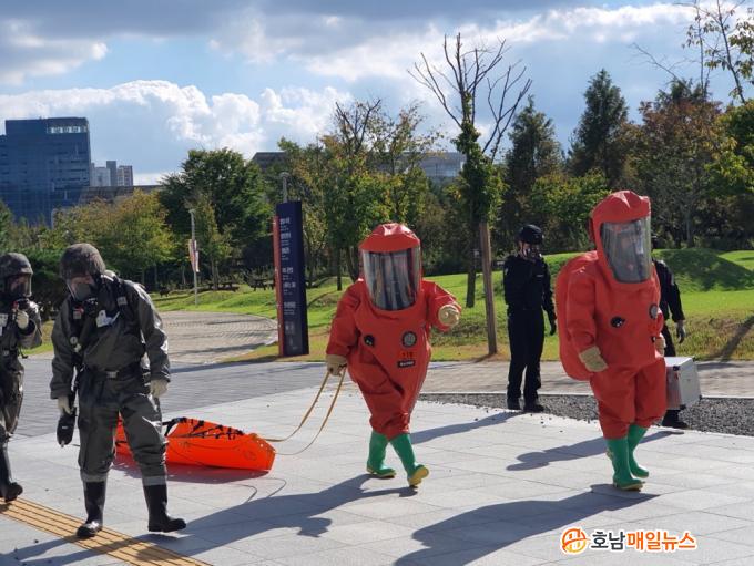 À̹ø ÈÆ·Ã¿¡´Â ±¤ÁÖ°æÂûû ¹× °æÂû¼, °æÂûƯ°ø´ë, ±¤ÁÖ¼Ò¹æ¾ÈÀüº»ºÎ 119Ư¼ö±¸Á¶´Ü, À°±º Á¦31º¸º´»ç´Ü°ú °ø±º Á¦1ÀüÅõºñÇà´ÜÀÇ È»ý¹æÁö¿ø´ë, ¿µ»ê°À¯¿ªÈ¯°æÃ» µî 16°³ ±â°üÀÌ Âü¿©ÇÏ¿© Æø¹ß¹° ¹× È»ý¹æ¹°Áú µîÀ» ÀÌ¿ëÇÑ º¹ÇÕÅ×·¯ »óȲÀ» °¡Á¤ÇÏ¿© ÈÆ·ÃÀ» ÁøÇàÇÏ¿´À¸¸ç ¡®Äڷγª19¡¯ °¨¿° È®»ê ¿¹¹æÀ» À§ÇØ Âü¿© ÀοøÀ» ¹é½ÅÁ¢Á¾ ¿Ï·áÀÚ À§ÁÖ 49ÀÎÀ¸·Î Á¦ÇÑÇÏ¿´´Ù.