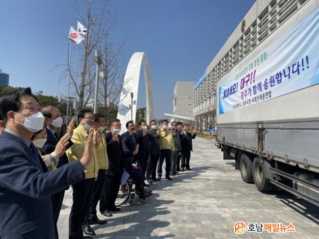ÇÑÆí, Áö¿ø »ý¼ö¸¦ ½ÇÀº Â÷·®Àº ¡°Èû³»¼¼¿ä ´ë±¸ Äڷγª19 ±Øº¹ ±¤ÁֽùÎÀÌ ÇÔ²² ÇÕ´Ï´Ù¡±¶ó´Â Èñ¸Á ¸Þ½ÃÁö¸¦ ´ã°í ¾ÆÄ§ ÀÏÂï ´ë±¸·Î Ãâ¹ßÇß´Ù.