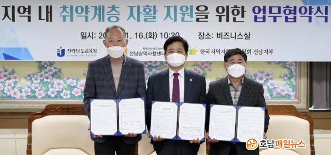 Àü¶ó³²µµ±³À°Ã»(±³À°°¨ Àå¼®¿õ)°ú Çѱ¹Áö¿ªÀÚȰ¼¾ÅÍÇùȸÀü³²ÁöºÎ(ÁöºÎÀå ÀÌÀçÈ£), Àü³²±¤¿ªÀÚȰ¼¾ÅÍ(¼¾ÅÍÀå ±è»ï¿ë)Àº 11¿ù 16ÀÏ(È) ºñÁî´Ï½º½Ç¿¡¼ »óÈ£ Çù·ÂÀ» À§ÇÑ ¾÷¹«Çù¾àÀ» ü°áÇß´Ù.