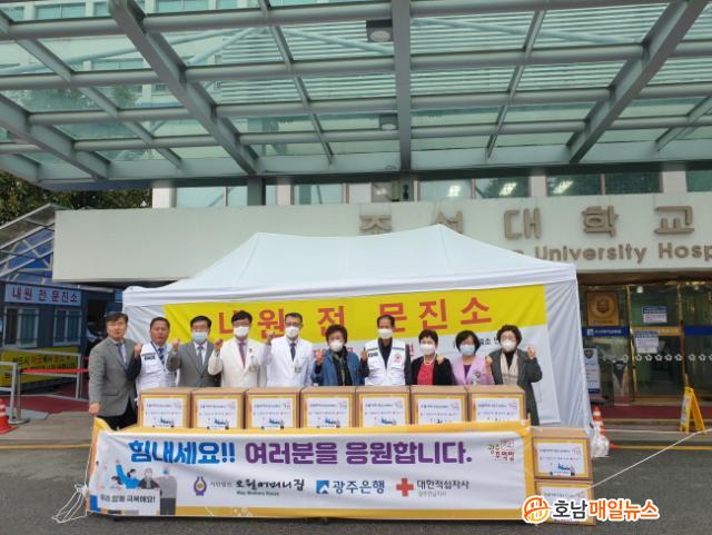 ±¤ÁÖ±¤¿ª½Ã´Â ¿À¿ù¾î¸Ó´ÏµéÀÌ ±¤ÁÖÁÖ¸Ô¹ä µµ½Ã¶ô 518°³¸¦ ¸¸µé¾î ±¹°¡ÁöÁ¤ÀÔ¿øÄ¡·áº´»óÀ» °®°í ÀÖ´Â Àü³²´ëº´¿ø, Á¶¼±´ëº´¿øÀ» ºñ·ÔÇØ °¨¿°º´Àü´ãº´¿øÀÎ ºû°íÀ»Àü³²´ëº´¿ø, ±¤Áֽø³Á¦2¿ä¾çº´¿ø µî ÃÑ 4°³ÀÇ ÀÇ·á±â°ü¿¡ µÎ Â÷·Ê¿¡ °ÉÃÄ Àü´ÞÇÑ´Ù.