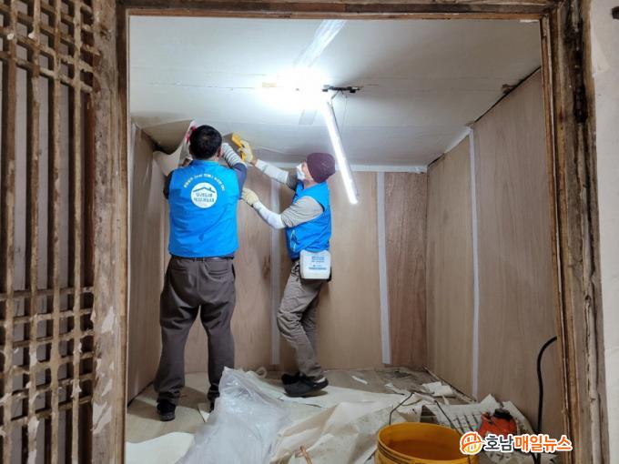 À̳¯ ºÀ»çÀÚµéÀº ³ëÈÄµÈ ÀåÆÇ°ú º®Áö¸¦ ±³Ã¼Çϱâ À§ÇØ ½Ç³» °¡±¸¿Í ¹°Ç°À» Á÷Á¢ ¿Å±â°í, ¹¬Àº °õÆÎÀ̸¦ ¾µ¾î ³»°í, »õ º®Áö¿Í ÀåÆÇÀ» ±³Ã¼ÇßÀ¸¸ç, ´Ü¿ °ø»ç±îÁö ½Ç½ÃÇß´Ù.