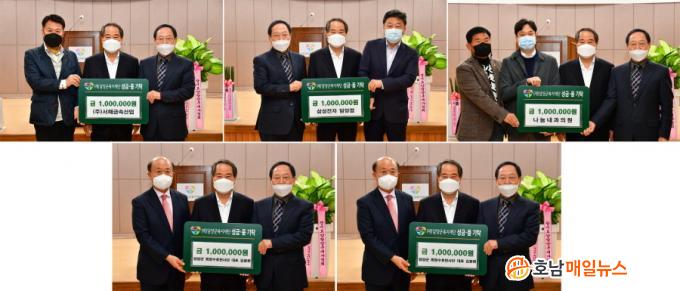 ´ã¾ç±ºº¹ÁöÀç´Ü¿¡ µû¸£¸é, »ï¼ºÀüÀÚ ´ã¾ç´ë¸®Á¡(´ëÇ¥ Á¤Æò±â)¿¡¼ 100¸¸ ¿ø, (ÁÖ)¼Çرݼӻê¾÷(´ëÇ¥ ¼¸íÈ£) 100¸¸ ¿ø, ³ª´®³»°úÀÇ¿ø(¿øÀå ¼ÕÁر¤) 100¸¸ ¿ø, ±Ý¼º¸é Èñ¸Á¼öȣõ»ç´Ü(´ëÇ¥ ÃÖ¶û¾Ï) 100¸¸ ¿ø, ´ã¾ç±º Èñ¸Á¼öȣõ»ç´Ü(´ëÇ¥ ±è±¤Çö) 100¸¸ ¿ø µî °÷°÷¿¡¼ ÀÌ¿ôÀ» À§ÇÑ ¿ÂÁ¤ÀÇ ¼º±ÝÀÌ Àü´ÞµÆ´Ù.