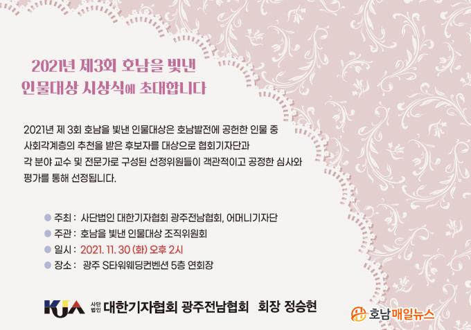 ÇÑÆí, »ç´Ü¹ýÀÎ ´ëÇѱâÀÚÇùȸ ±¤ÁÖ¡¤Àü³²Çùȸ¿Í ¾î¸Ó´Ï±â´ÜÀÌ °øµ¿ ÁÖÃÖÇÑ ¡®2021³â Á¦3ȸ È£³²À» ºû³½ Àι°´ë»ó¡¯ ½Ã»ó½ÄÀº ¿À´Â 11¿ù 30ÀÏ(È) ¿ÀÈÄ 2½Ã ±¤Áֽà ¼±¸ Ä¡Æòµ¿¿¡ À§Ä¡ÇÑ SŸ¿ö¿þµùÄÁº¥¼Ç 5Ãþ ¿¬È¸Àå¿¡¼ °³ÃֵȴÙ.