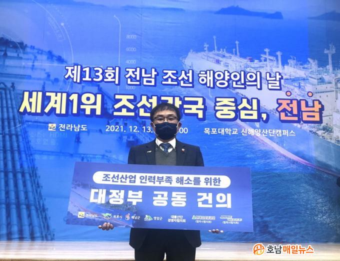 À̳¯ Çà»ç¿¡´Â ±è¿µ·Ï Àü³²µµÁö»ç¸¦ ºñ·ÔÇØ ±èÁ¾½Ä ¸ñÆ÷½ÃÀå, ¸íÇö°ü ÇØ³²±º¼ö, Àüµ¿Æò ¿µ¾Ï±º¼ö ¹× Á¶¼±¾÷°è ´ëÇ¥µéÀÌ Âü¼®ÇØ ¡¸Á¶¼±»ê¾÷ ÀηºÎÁ· ÇØ¼Ò¸¦ À§ÇÑ ´ëÁ¤ºÎ °øµ¿°ÇÀǼ¡¹¸¦ äÅÃÇÏ¿´°í, Á¶¿ÁÇö ÀÇ¿øµµ ¡°Áö¿ª ³» Á¶¼±¾÷°èÀÇ ÀηºÎÁ·À¸·Î ÀÎÇÑ ¾î·Á¿ò°ú ±× ½Ã±ÞÇÔÀ» Àß ¾Ë±â¿¡ °·ÂÇÑ °ÇÀÇ Àǻ縦 ÀüÇÑ´Ù¡±¸ç µ¿ÂüÀÇ ¶æÀ» ¹àÇû´Ù.