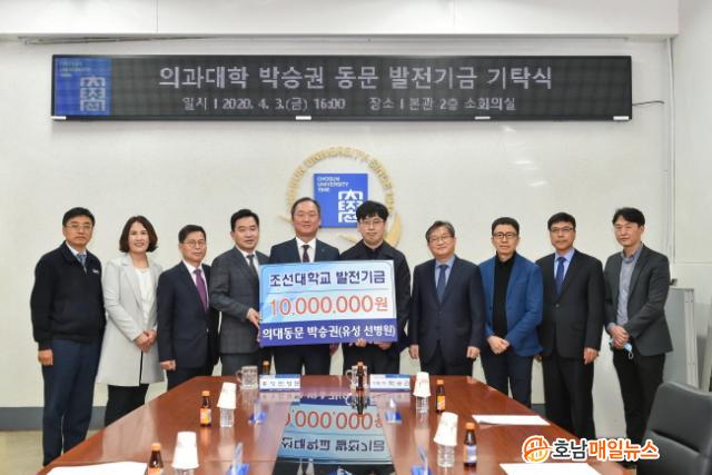 3ÀÏ Á¶¼±´ëÇб³´Â Àǰú´ëÇÐ µ¿¹®ÀÎ ¹Ú½Â±Ç(36) À¯¼º ¼±º´¿ø Á÷¾÷ȯ°æÀÇÇм¾ÅÍ Áø·á°úÀåÀ¸·ÎºÎÅÍ ¹ßÀü±â±Ý 1000¸¸¿øÀ» ±âŹ ¹Þ¾Ò´Ù. ±âʽÄÀº À̳¯ ¿ÀÈÄ 4½Ã Á¶¼±´ëÇб³ º»°ü ¼ÒȸÀǽǿ¡¼ °³ÃֵƴÙ.
